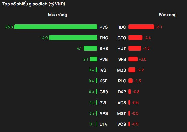 Tại chiều mua, PVS được mua ròng mạnh nhất với giá trị 26 tỷ đồng. Bên cạnh đó, TNG xếp tiếp theo trong sách mua ròng mạnh trên HNX với 15 tỷ đồng. Ngoài ra, khối ngoại cũng chi vài tỷ đồng để gom ròng SHS, PVB, IVS.