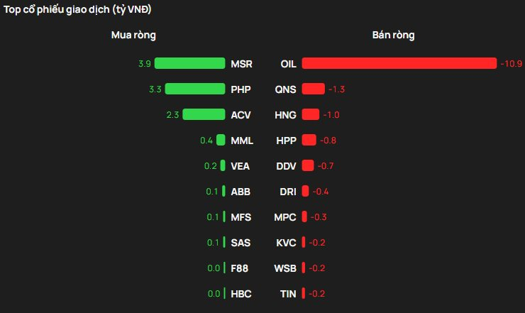 Ngược chiều, OIL bị khối ngoại bán ròng 11 tỷ đồng. Ngoài ra khối ngoại cũng bán ròng tại QNS, HNG,...