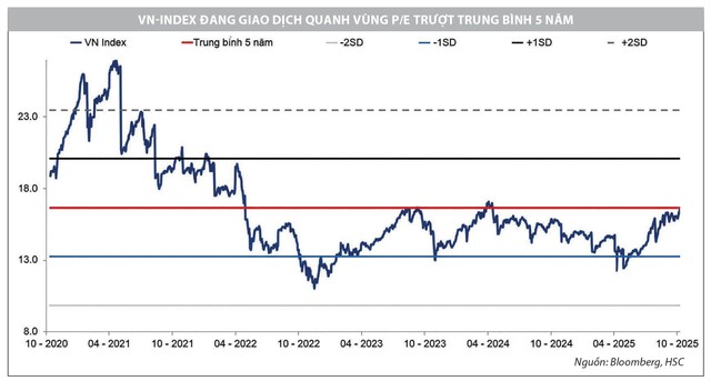 Kết quả kinh doanh quý III/2025, được công bố dần trong tháng 10 này, sẽ là yếu tố quan trọng nhất dẫn dắt thị trường trong thời gian tới. Sau nhịp hồi phục mạnh, định giá thị trường hiện không còn ở mức quá rẻ, với P/E trượt khoảng 16,3 lần, tiệm cận mức trung bình 5 năm là 16,7 lần.