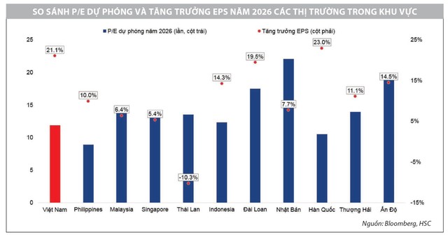 Đà tăng trưởng năm 2025, cùng với chính sách tài khóa hỗ trợ, tín dụng mở rộng và đầu tư công duy trì mạnh mẽ, đang củng cố niềm tin vào một chu kỳ tăng trưởng bền vững hơn hướng tới năm 2026. Với triển vọng lợi nhuận tích cực, VN-Index hiện đang giao dịch ở mức P/E dự phóng 2026 khoảng 12 lần, cho thấy định giá vẫn ở vùng hấp dẫn so với các thị trường cùng khu vực, trong bối cảnh tăng trưởng lợi nhuận toàn thị trường dự kiến trên 20%.