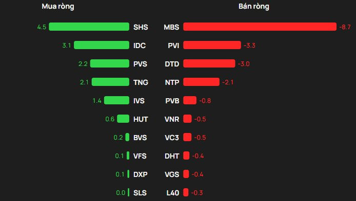 Ở chiều mua, SHS được khối ngoại gom ròng mạnh nhất với giá trị khoảng 5 tỷ đồng, IDC cũng được rót ròng gần 3 tỷ đồng. Theo sau là PVS (+2 tỷ), TNG (+2 tỷ) và IVS (+1 tỷ), đều nằm trong top mua ròng phiên nay.