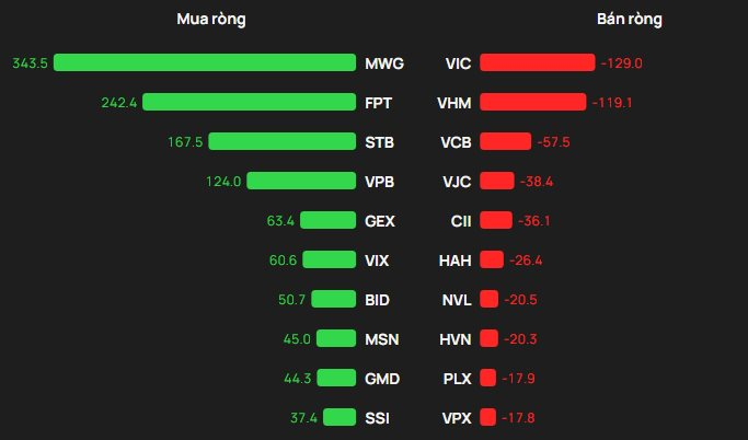 Ở chiều mua, cổ phiếu MWG được khối ngoại gom ròng mạnh nhất với giá trị khoảng 344 tỷ đồng, FPT cũng được rót ròng hơn 242 tỷ đồng. Theo sau là STB (+168 tỷ), VPB (+124 tỷ) và GEX (+63 tỷ), đều nằm trong nhóm được giải ngân đáng kể.