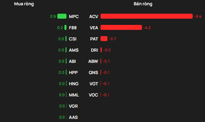 Ở chiều ngược lại, khối ngoại bán ròng mạnh nhất tại ACV với quy mô khoảng 9 tỷ đồng. Các mã VEA (-4 tỷ), PAT (-1 tỷ), DRI (-0,2 tỷ) và ABW (-0,1 tỷ) cũng ghi nhận áp lực xả ròng trong phiên.