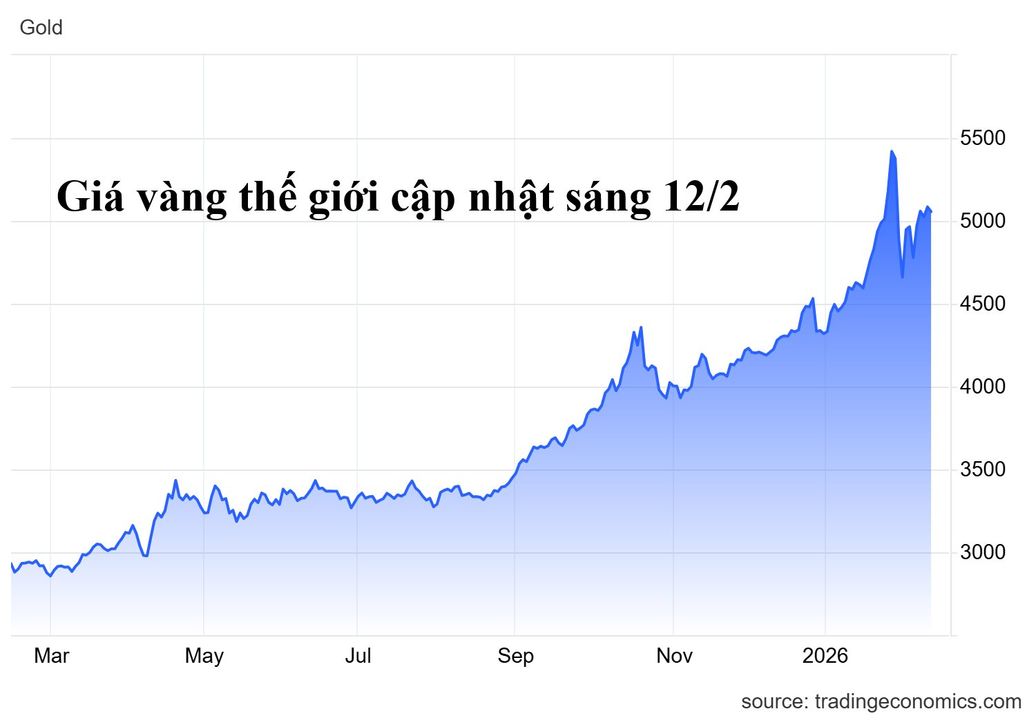 Sang phiên sáng 12/2, giá kim loại quý này đang giao dịch quanh mốc 5.056 USD/oz, giảm nhẹ 0,6% so với phiên liền trước. Như vậy, giá vàng thế giới đã di chuyển quanh vùng 5.000-5.100 USD/ounce trong khoảng 4 phiên liên tiếp, qua đó dần hình thành mặt bằng giá với cho tài sản này sau giai đoạn tăng phi mã từ đầu năm.