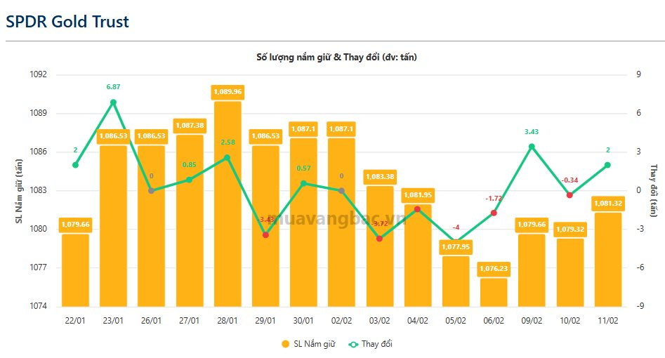 Theo cập nhật từ muavangbac.vn, quỹ vàng lớn nhất thế giới SPDR Gold Trust đã mua thêm 2 tấn vàng trong ngày 11/2, nâng tổng lượng nắm giữ lên 1.081 tấn. SPDR do State Street Global Advisors quản lý – tổ chức chuyên cung cấp các dịch vụ quản lý đầu tư tổ chức tập trung vào chỉ số vốn cổ phần và tiền mặt.