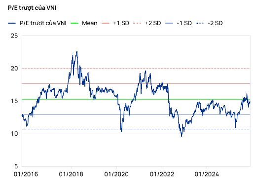 Trong báo cáo mới đây, Chứng khoán Vietcap nhận định định giá của VN-Index đang ở mức hợp lý khi hệ số P/E trượt 12 tháng đạt 16,4 lần, gần bằng mức trung vị 10 năm, đặc biệt trong bối cảnh Việt Nam đã đặt kế hoạch tăng trưởng GDP 10% cho năm 2026.