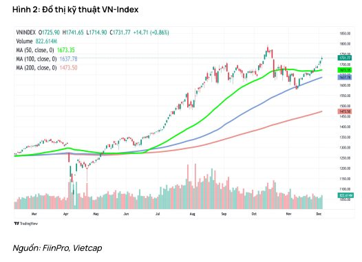 Về mặt kỹ thuật, Vietcap đánh giá từ nửa cuối tháng 11 đến đầu tháng 12, VN-Index đã hồi phục mạnh nhờ sự dẫn dắt luân phiên của một số mã vốn hóa lớn, sau khi chỉ số lấy lại trạng thái cân bằng tại hỗ trợ MA100. Tuy nhiên, sức lan tỏa sang phần lớn cổ phiếu còn khá hạn chế, thể hiện ở thanh khoản suy giảm và diễn biến đi ngang của nhiều mã.