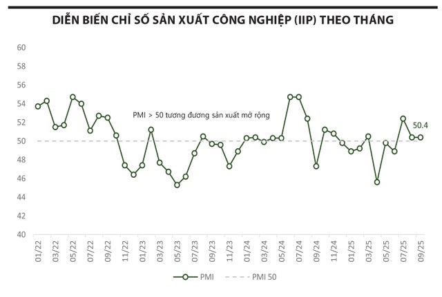 Chỉ số PMI duy trì ở mức 50,4 điểm cho thấy điều kiện kinh doanh cải thiện ba tháng liên tiếp khi đơn hàng mới phục hồi nhẹ. Dù nhu cầu quốc tế còn yếu với đơn hàng xuất khẩu giảm, tốc độ giảm đã chậm lại, xuống mức thấp nhất trong 11 tháng gần đây. Điều này phản ánh môi trường kinh tế toàn cầu dần ổn định hơn sau khi Mỹ công bố mức thuế quan mới.