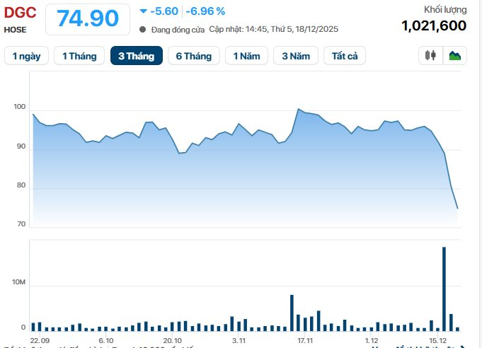 Sóng gió vẫn chưa buông tha cổ đông Tập đoàn Hóa chất Đức Giang. Kết phiên 18/12, cổ phiếu DGC tiếp tục giảm hết biên độ xuống còn 74.900 đồng/cp, đánh dấu phiên "lau sàn" thứ 3 liên tiếp.