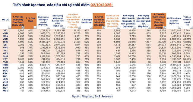Ông Hạnh lưu ý, cấu trúc FTSE EM thiên về large-cap; tập trung nhóm có free float cao, room ngoại còn lại đủ, room ngoại mở. Chiến lược đầu tư tối ưu nhất vẫn là ưu tiên mã vượt dư chuẩn, tránh mã sát ngưỡng (FOL “mấp mé” nhỉnh hơn mốc 20% một ít), vì chỉ cần 1 - 2 tháng kém thanh khoản hoặc room đầy là không đủ điều kiện thêm mới hoặc duy trì.