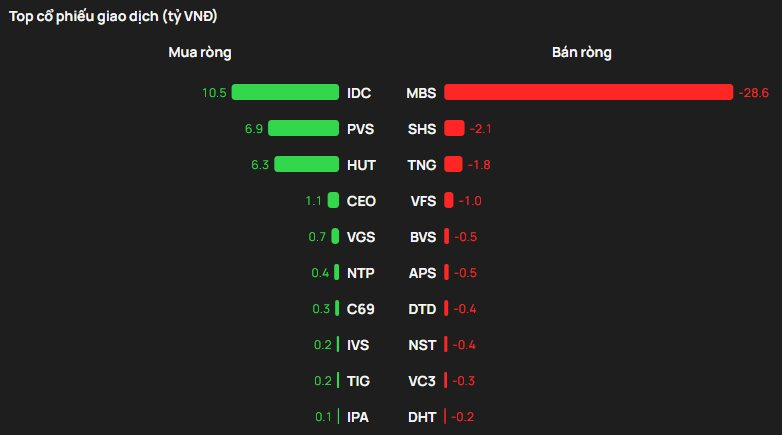 Tại chiều mua, IDC được mua ròng mạnh nhất với giá trị 11 tỷ đồng. Bên cạnh đó, PVS xếp tiếp theo trong sách mua ròng mạnh trên HNX với 6,9 tỷ đồng. Ngoài ra, khối ngoại cũng chi vài tỷ đồng để gom ròng HUT, CEO, VGS.