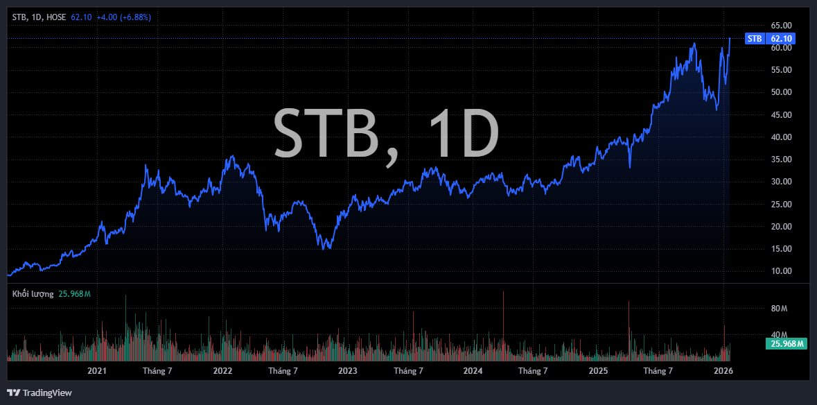 Trên sàn chứng khoán, cổ phiếu STB chốt phiên 21/1 tăng kịch biên độ, trong tình trạng “trắng bên bán” bất chấp thị trường điều chỉnh. Chỉ trong vòng hơn 1 tháng trở lại đây, thị giá STB đã tăng gần 35% qua đó lập đỉnh mới 62.100 đồng/cp. Vốn hóa thị trường cũng theo đó lập kỷ lục 117.000 tỷ đồng.